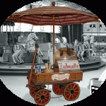 In unseren historischen Verkaufswagen mit Waffelbäckerei von ca. 1930 bieten wir unter anderem Flammkuchen, Süßwaren wie Popcorn und Eis sowie warme und kalte Getränke inklusive einer Vielzahl an Kaffeespezialitäten an.